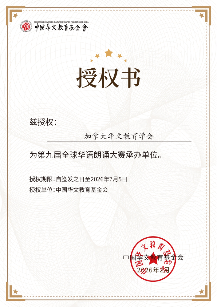 Under the guidance of the China Foundation for Chinese Language Education, the 2026 Global Chinese Recitation Competition – Toronto Region, is organized by the Canadian Chinese Education Society, and now officially open for registration. We warmly invite students who love Chinese language and the art of recitation to take part in this meaningful cultural journey—where voices meet the classics and language whereby both connects the hearts.
